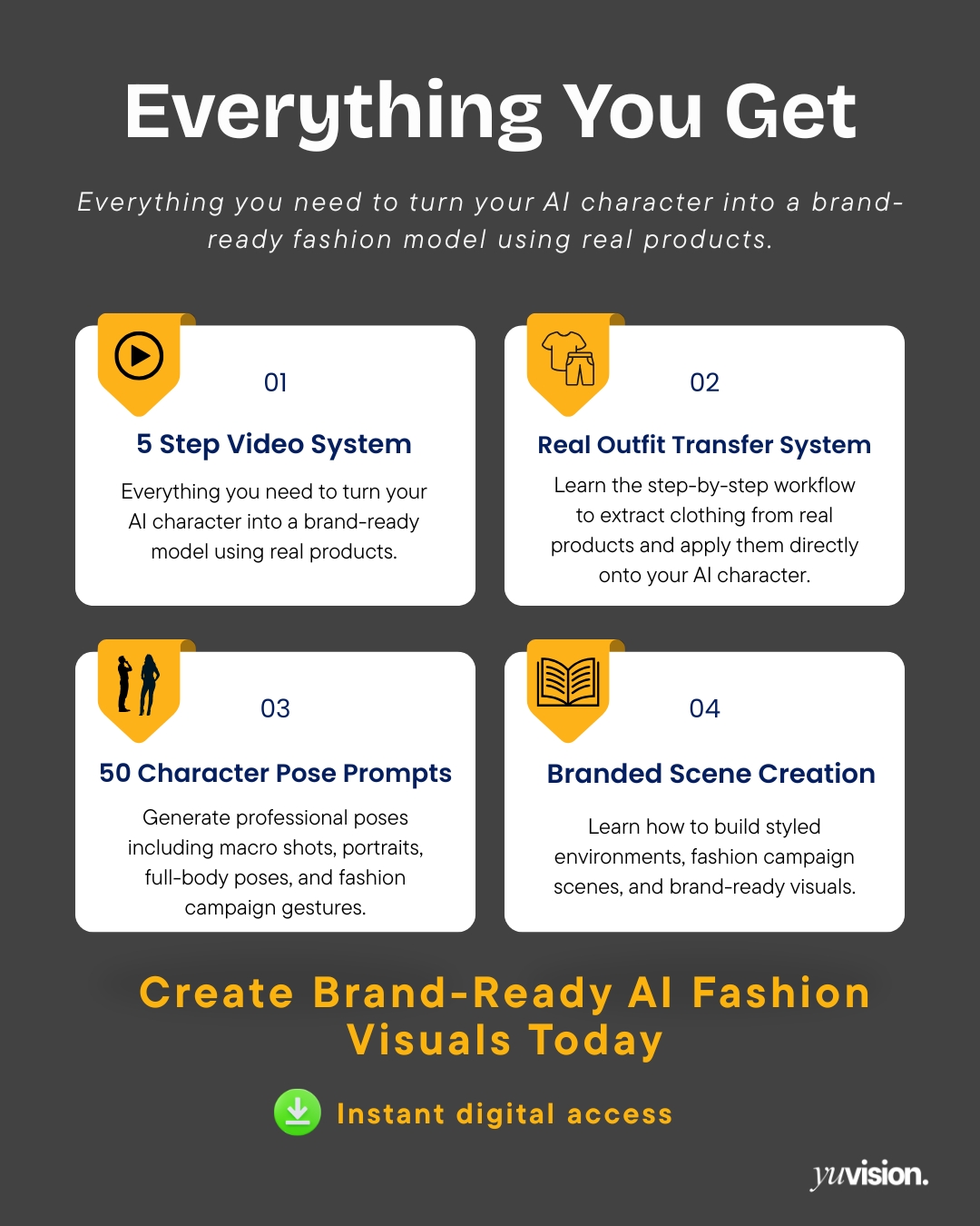 By the end of this level, you’ll be able to create professional AI visuals that look like real fashion campaigns and product marketing images.